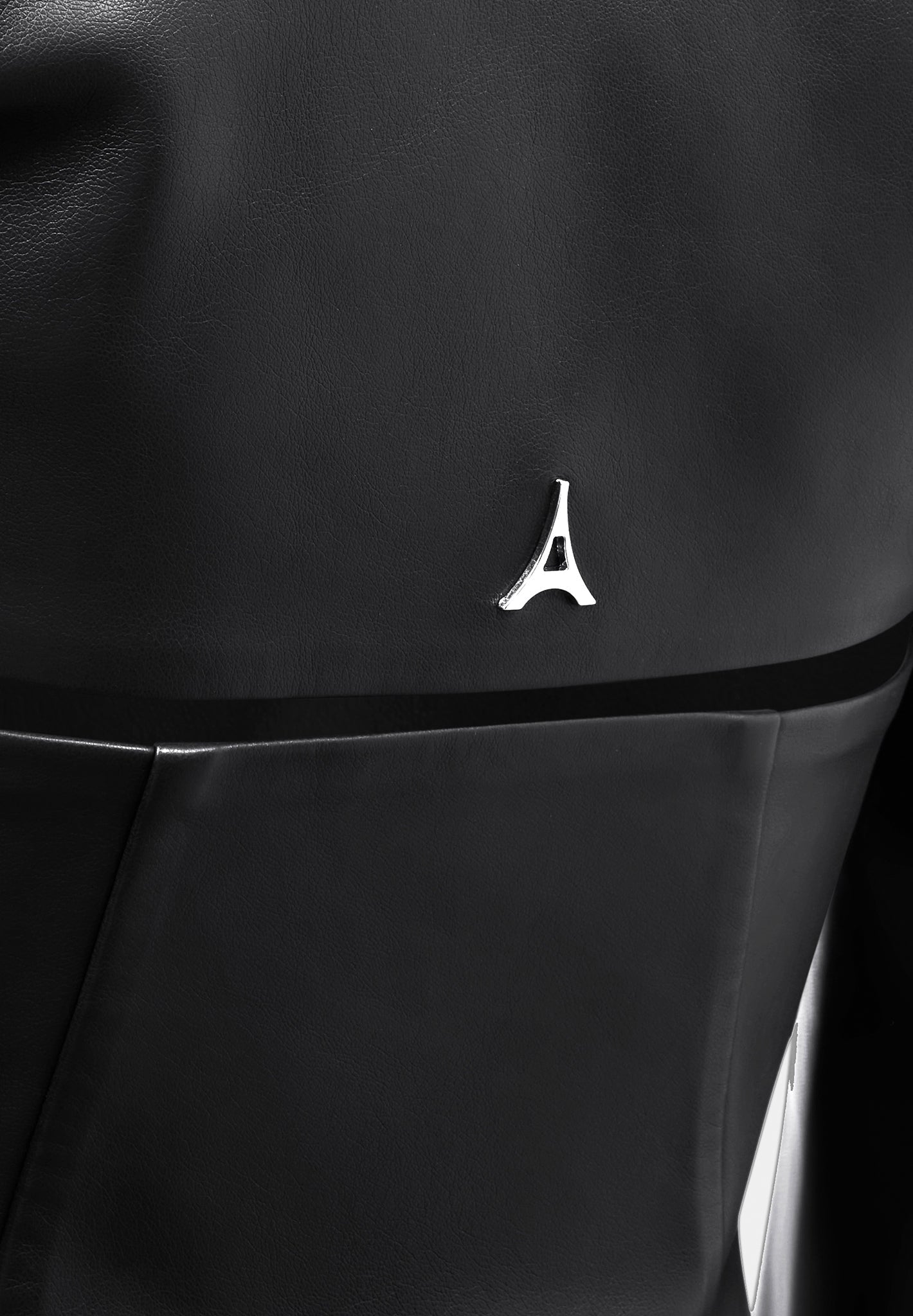 This vegan leather blazer in black offers a tailored fit for a sophisticated look. Its unique cut out design is a modern take on a timeless classic. Perfect for confident, fashion-forward individuals.